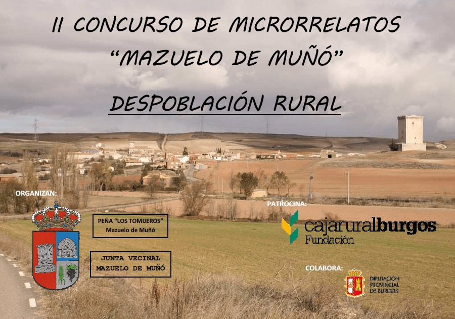 La Junta Vecinal de Mazuelo de Muñó, junto con su asociación, la Peña «Los Tomijeros», contando con el patrocinio de la Fundación Caja Rural y la Excma. Diputación Provincial de Burgos, convoca el II CONCURSO DE MICRORRELATOS «MAZUELO DE MUÑÓ» para concienciar sobre todo a nuestros jóvenes, pero no exclusivamente a ellos, del gran problema que representa la DESPOBLACIÓN RURAL.