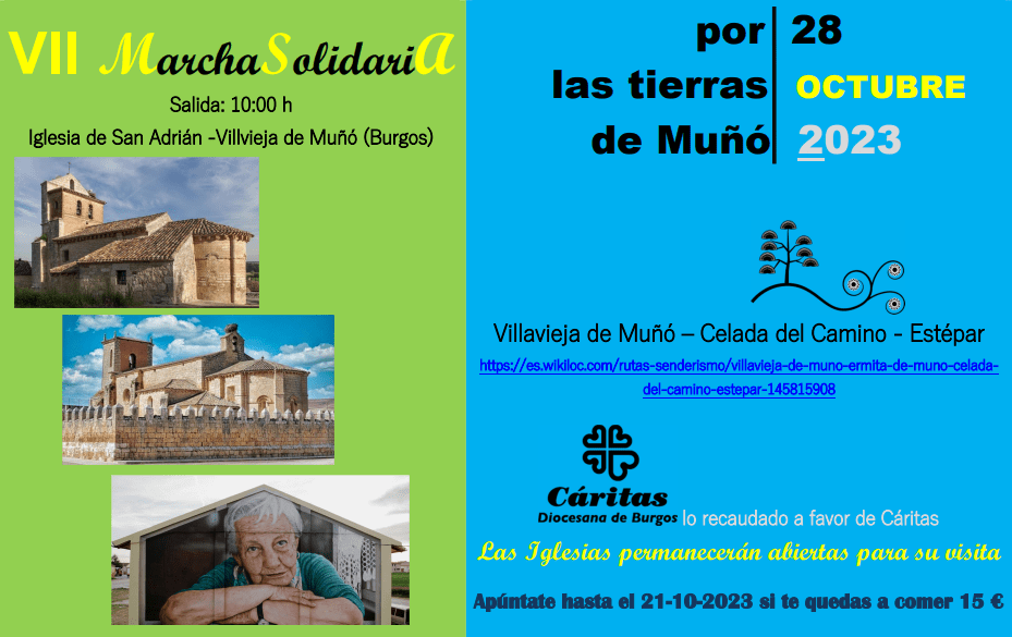 La salida será desde la Iglesia de San Adrián en Villavieja de Muñó a las 10:00 horas el día 28 de octubre de 2023. El recorrido https://es.wikiloc.com/rutas-senderismo/villavieja-de-muno-ermita-de-muno-celada-del-camino-estepar-145815908 son unos doce kilómetros.